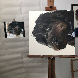 I’ve been avoiding the studio (or, going to the studio but not really accomplishing anything). I have this commission that must be finished tonight so that I can hang it at Christopher’s in the morning, to replace one there that is being delivered to its home in NY. As I’ve written before, the music from Hamilton is my savior in these moments, propelling me along, keeping me moving and focused on the painting in front of me rather than drawn toward my phone to check an email or text or social media.