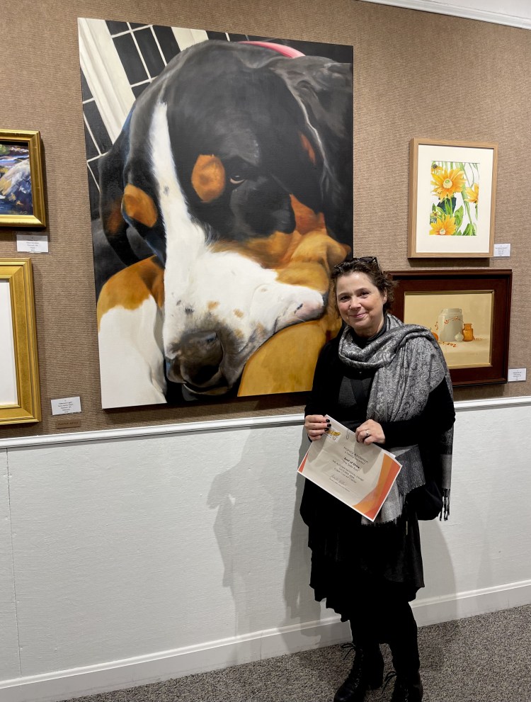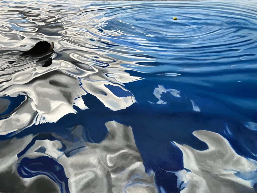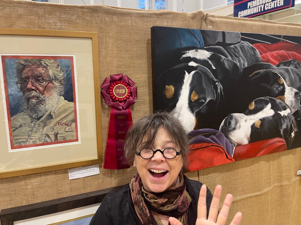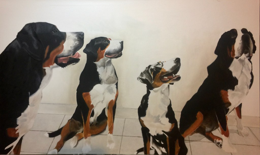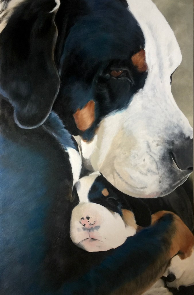 Different paintings work up at different rates for different reasons. This one took twice as long— and then, as it was near completion, it seemed that every time I thought I was done, I saw another part that I needed to work on. And so it went, day after day… changes that may not be noticeable, but altogether I think it tightened up the visual. This painting is for a charity auction (for the Greater Swiss Mountain Dog Club of America Health Fund, which allocates funding to research health conditions in the breed), the winner of which serves as the display example for the next year’s auction.