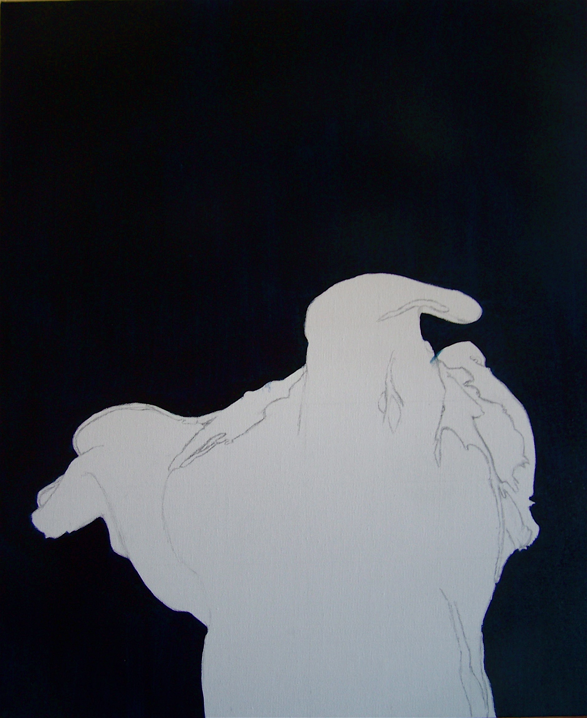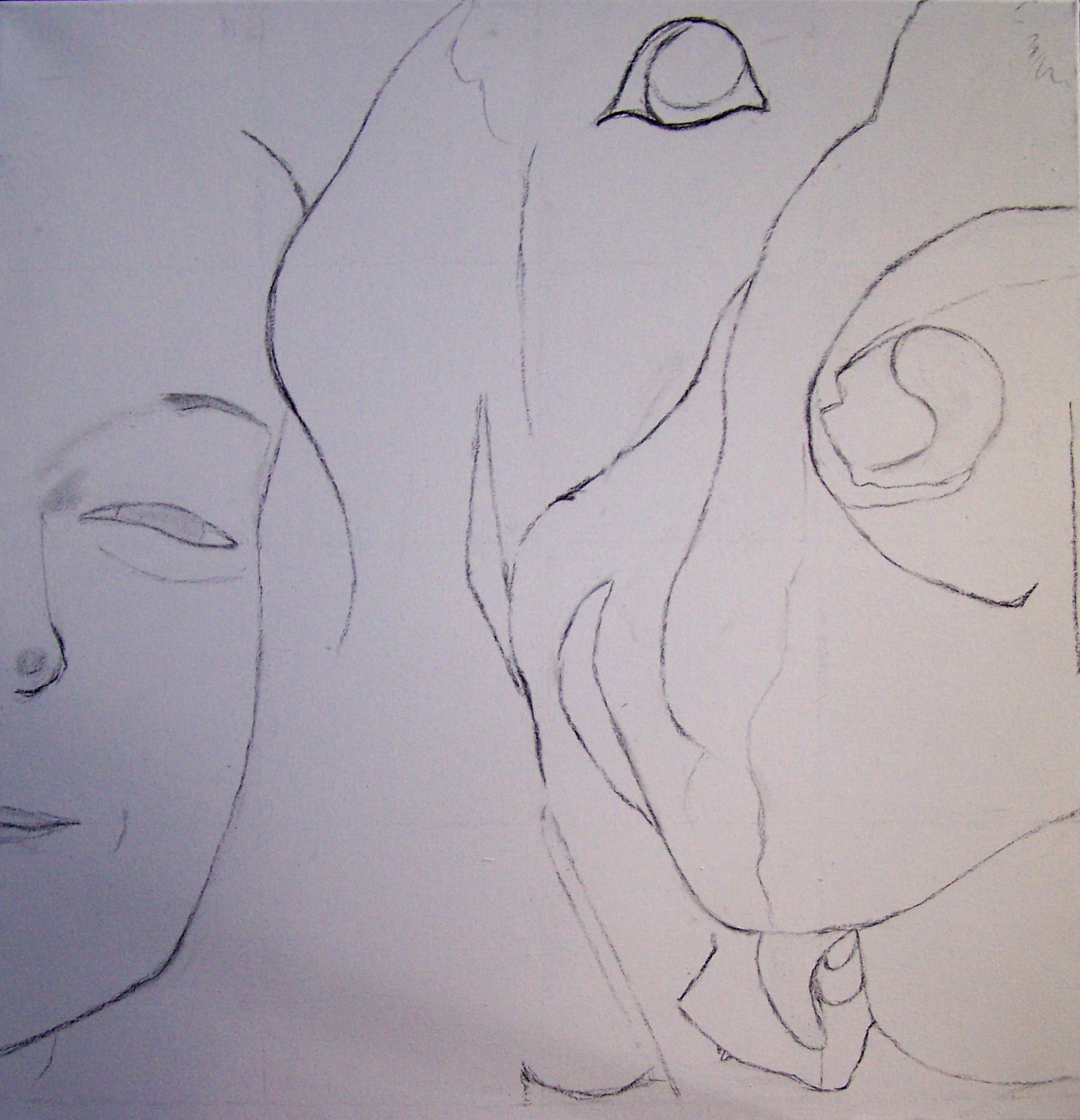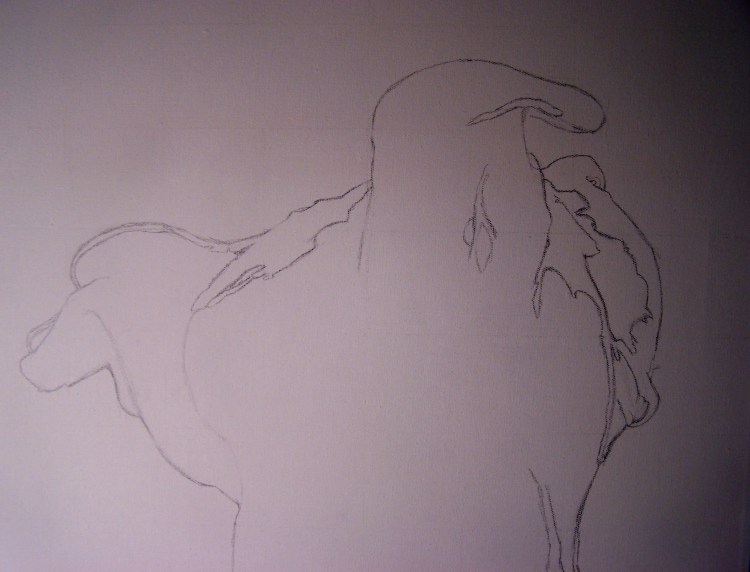 As I was putting down the basic sketch, I was using pencil rather than charcoal, and was working in a more detailed way. Normally, I just throw down some charcoal lines and go, but I was kind of getting into it. This canvas is 20″ x 24″ – which is smaller than I’ve been working, and I was reminded of how much I loved doing smaller, more detailed work. I wanted to just sit and use tiny brushes and be anal. It also made me want to just draw, which I haven’t done in, um… years.